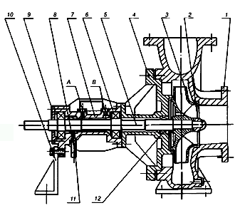 1、泵體 2、葉輪螺母 3、葉輪 4、泵蓋 5、泵軸 6、軸承 7、軸承體 8、導(dǎo)油管 9、軸承壓蓋 10、支架 11、油封 12、填料